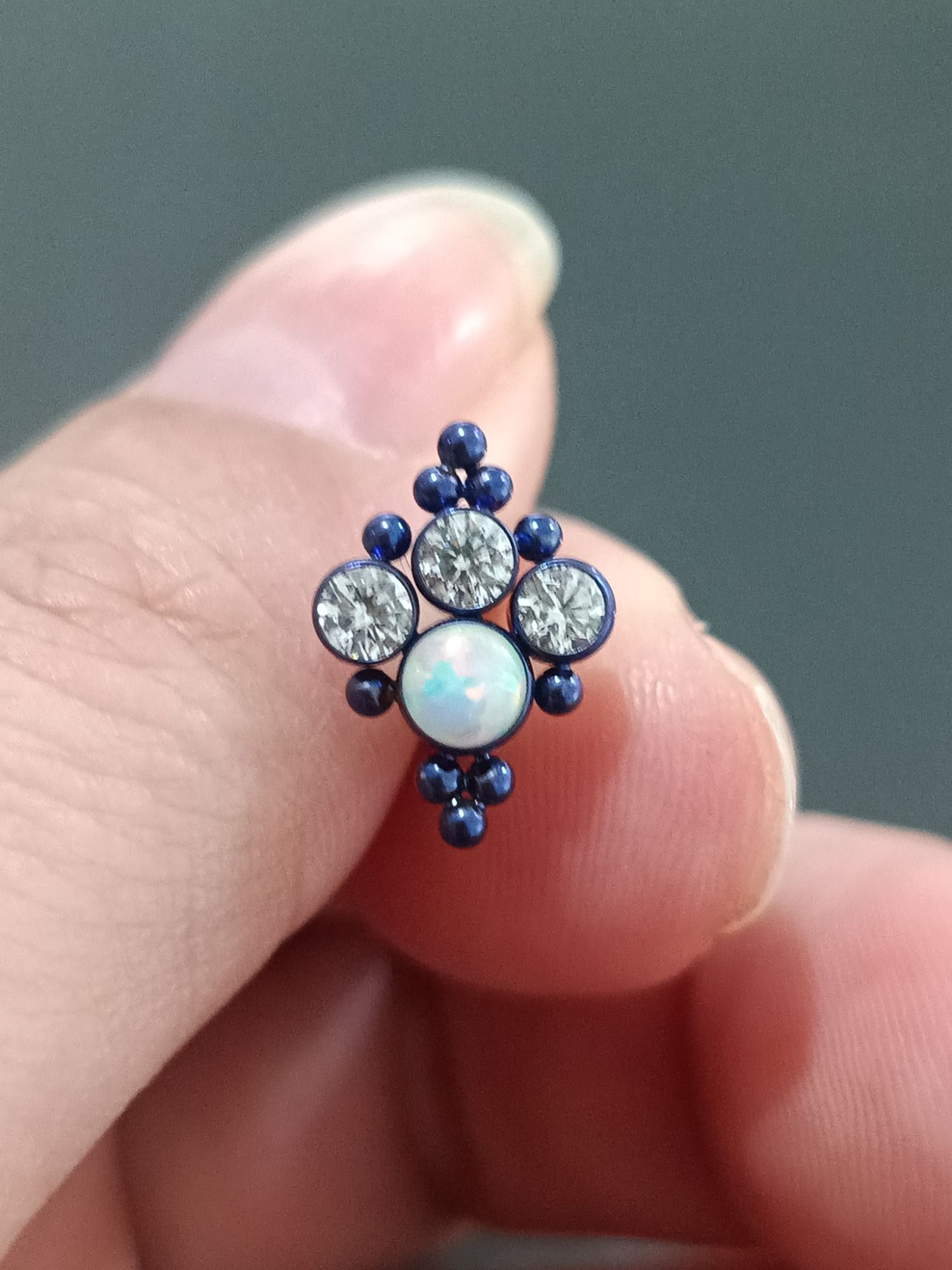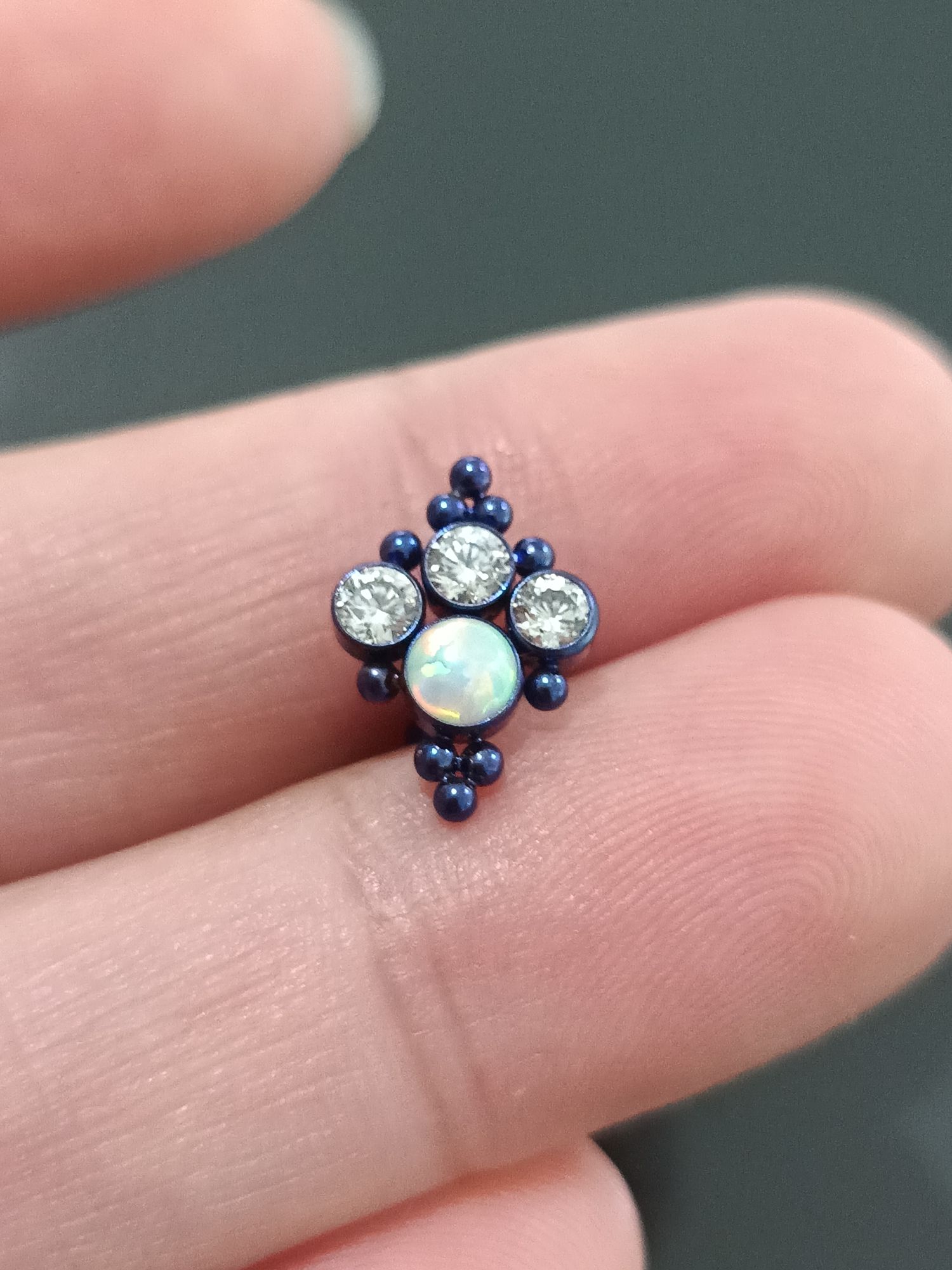 Joia confeccionada, com materiais de alto padrão, titânio grau de implante, pedra opala e pedras de zircônia.